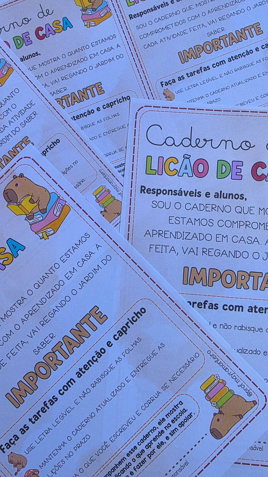 O Caderno de Lição de Casa é uma folhinha com design lúdico e ilustrações fofas de capivaras, ele é o guia perfeito para estreitar os laços entre pais, alunos e professores.