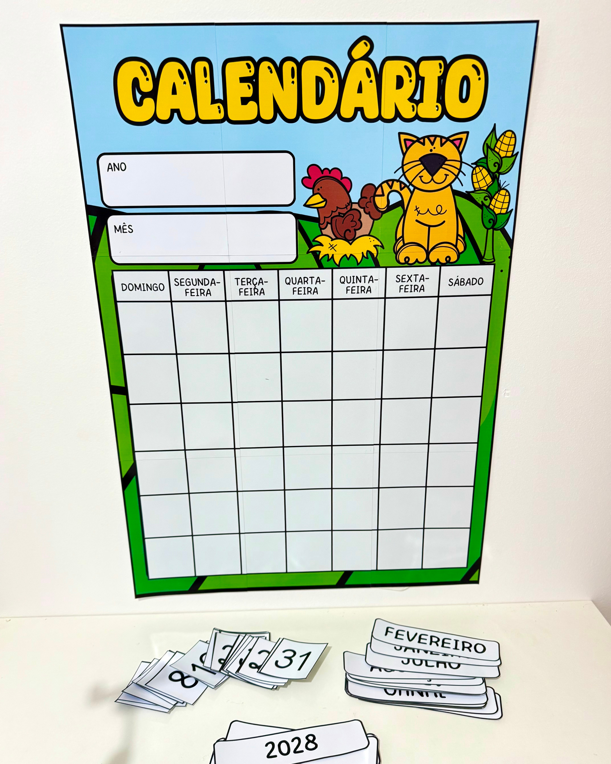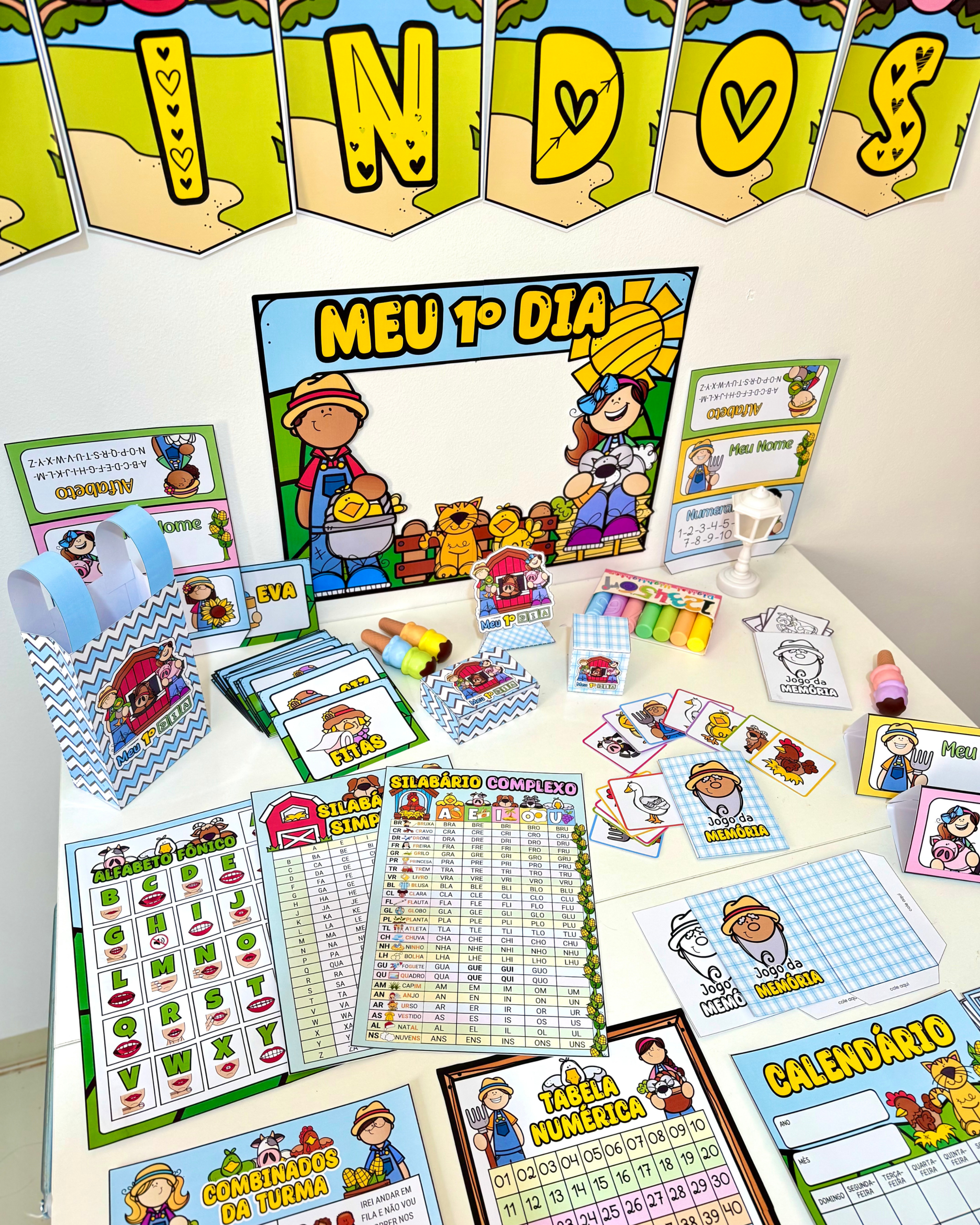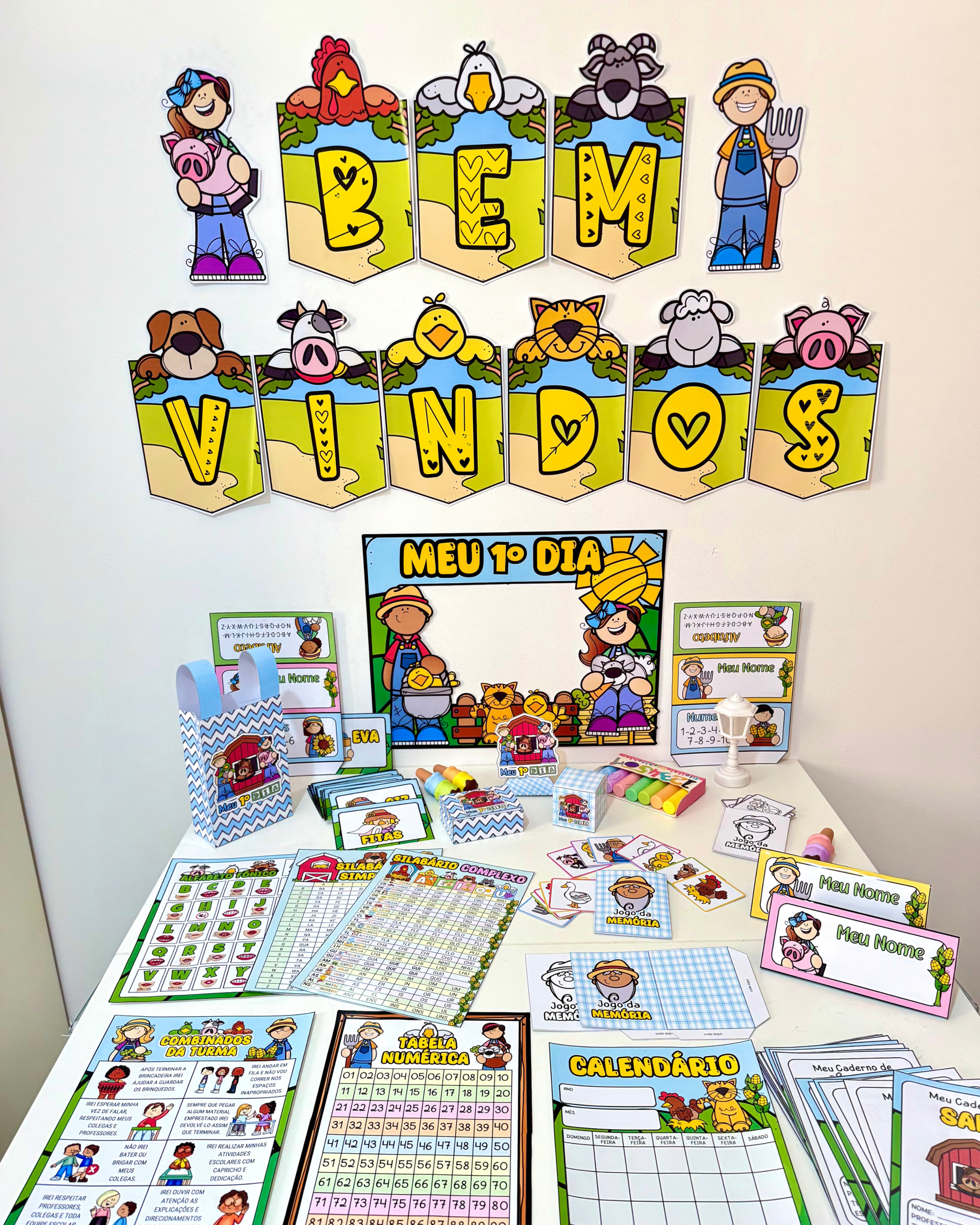 Infantil e séries iniciais do Ensino Fundamental. O kit vai com 28 arquivos, que incluem: Lembrancinhas primeiro dia Alfabeto fônico (76cm x 53cm) Moldura 1º dia Capas de caderno Calendário peças móveis (73cm x 51cm) Combinados (76cm x 53cm)