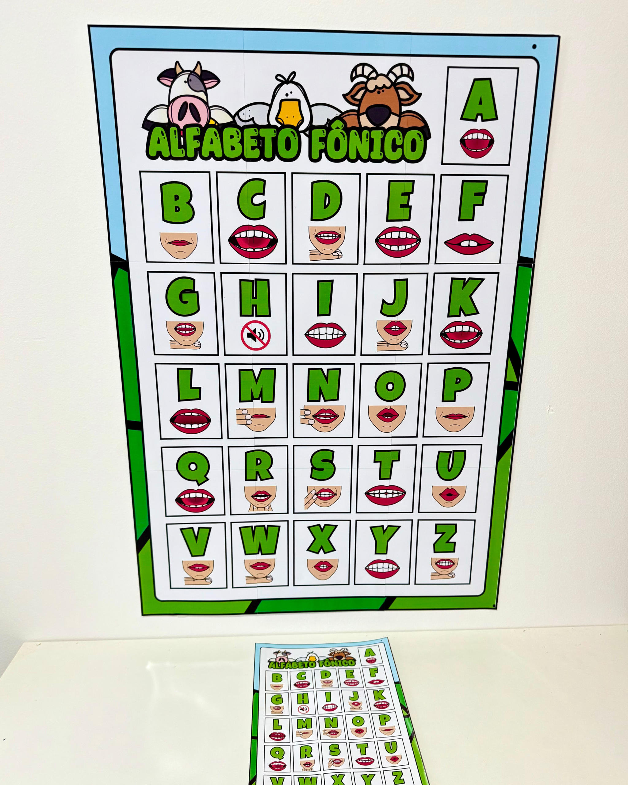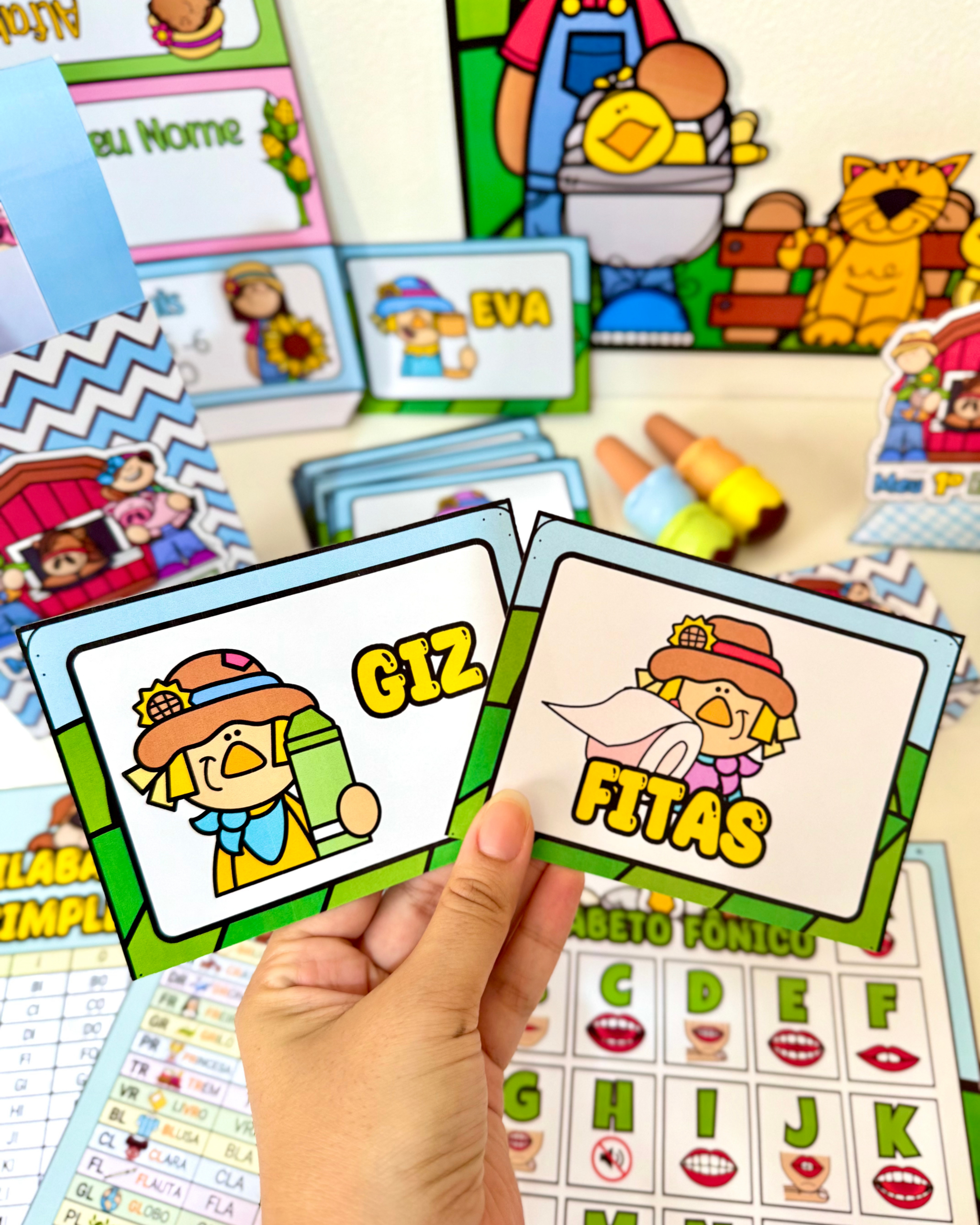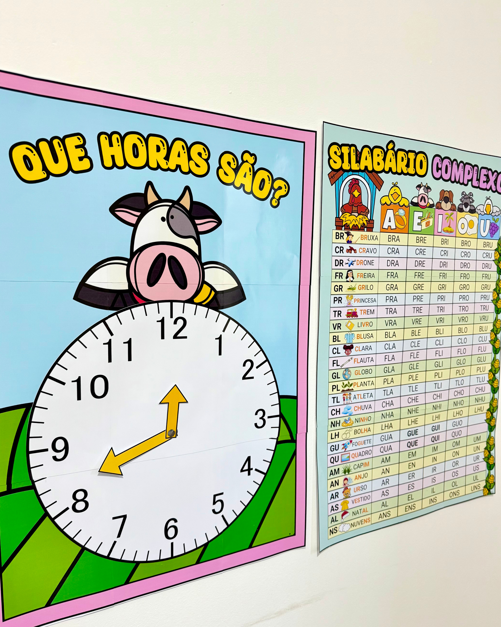 Infantil e séries iniciais do Ensino Fundamental. O kit vai com 28 arquivos, que incluem: Lembrancinhas primeiro dia Alfabeto fônico (76cm x 53cm) Moldura 1º dia Capas de caderno Calendário peças móveis (73cm x 51cm) Combinados (76cm x 53cm)